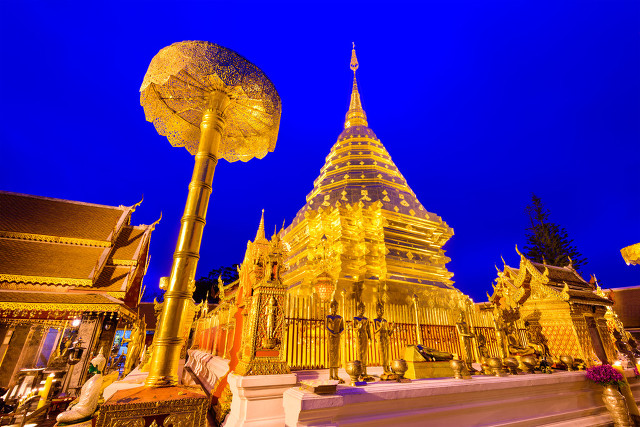 双龙寺(Wat Phra That Doi Suthep) 双龙寺又称作素帖寺,它位于地势最高的地方。这里金碧辉煌的外表绝对让你大开眼界。走进这座充满传奇色彩的寺庙,你不仅能沉醉在浓郁的泰国佛教文化之中,还可以俯瞰秀美市景。不过,进到寺庙里记得要脱鞋哦!里面的陈设简单素雅,人们供佛也是用鲜花而不是烧香,这点让人颇为喜欢。佛寺鲜花处处,绝无烟熏火燎。