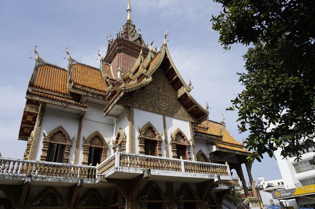 布帕拉姆寺(Wat Bupharam) 布帕拉姆寺建于兰纳王朝最兴盛佛教时期,带有缅甸建筑风格的二层小楼,雕梁画栋花团锦簇,建筑融合了缅甸和兰纳两种风格,院落中散布着各式各样的雕塑,除了知名的唐老鸭,还有许多小娃娃、小动物哦!不得不说是一座非常可爱的寺庙。它因《泰囧》而成为有名气景点。泰国国王普密蓬年轻的时候在这座寺院里修行过,大殿里挂有国王的照片。这个美丽的小地方,到处都是古老的木雕,古色古香。