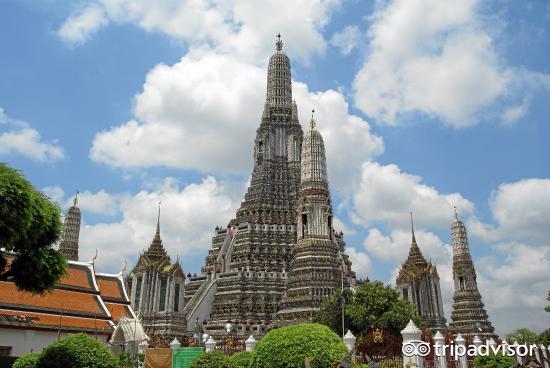 黎明庙(Temple of Dawn) 黎明寺位于泰国湄南河西岸的双子都市吞武里城,寺院人口处有巨型守护神石像,寺内有五座一模一样的佛塔,一大四小。大塔是79米高的婆罗门式尖塔——巴壤塔,有“泰国的埃菲尔铁塔”的美称哦。巴壤塔及其周围四座与之呼应的陪塔,形成一组庞大而美丽的塔群。大塔内有阶梯供游客攀爬,你可以在塔上可以极目眺望湄南河对岸的曼谷市景。主塔庙堂现供有郑昭王像及遗物,殿内还悬有中国式的灯笼。