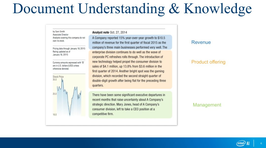 领域专家在这个过程中贡献出自己对业务的理解:希望从哪种角度收集数据,希望看到算法给出何种结果。有时候,他们需要的并不是情感分析或者趋势分析这种已经有成熟定义和解决方案的模型,而是结合不同的深度学习模块,组合成一个他们需要的全新的东西。英特尔在此基础上进行数据科学工作和技术服务,在了解了问题之后,判断何种模型可以帮助他们,再提供算法设计,并将整个算法连接到英特尔的深度学习框架乃至硬件上面。