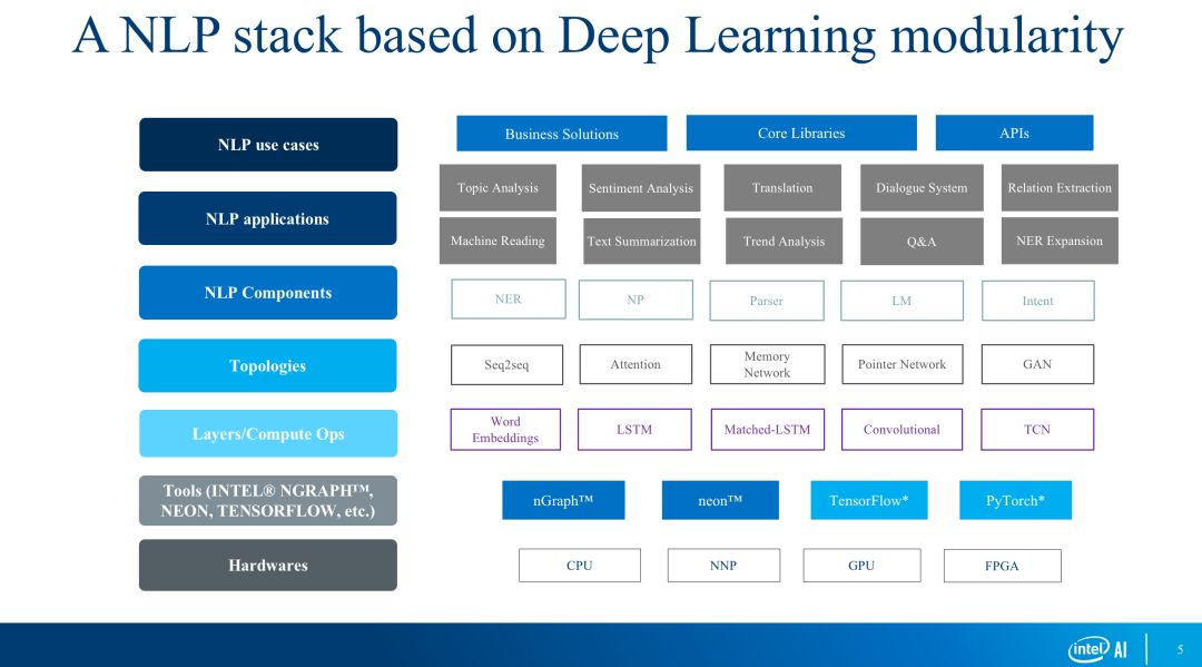 刘茵茵:自然语言处理是一个很有挑战、很有发展空间的领域。大部分自然语言任务需要用递归神经网络(RNN)处理时间序列(temporal sequence)、进行循环展开,这是一个很难并行的过程,因此在硬件方面,对从内存中快速提取数据的能力、内存能够支持的模型容量等都有较高要求;在框架方面,也有与可并行模型截然不同的优化需求。所以英特尔在高层直接优化(HLO,提供多核架构优化)和 nGaph(提供框架和底层硬件连接优化)层面都会对众多 NLP 模型进行持续的优化和基准衡量(benchmarking),确保其在硬件以及框架层面获得最好的支持。