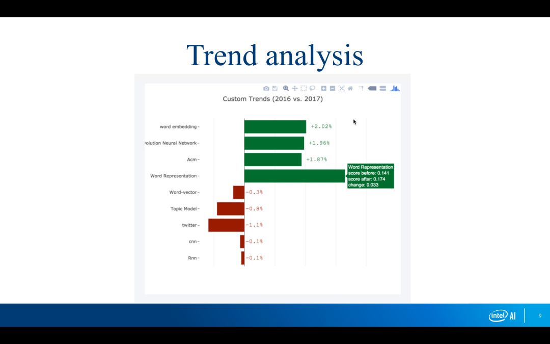 刘茵茵:趋势分析的分析对象是文本库,目标是从文本库中提取关键的名词短语(noun phrase),然后通过衡量每个短语的相关性和重要性并进行加权打分,来比较不同文本库之间的趋势与变化。我们已经将算法用于学术期刊的趋势分析,旨在让初学者,尤其是刚刚开始研究深度学习的数据科学工作者能够看到领域里一些概念在学术期刊汇总的热度与趋势。算法也可以用于其他领域,例如产品分析、市场分析、热门话题分析,都是理想的应用场景。