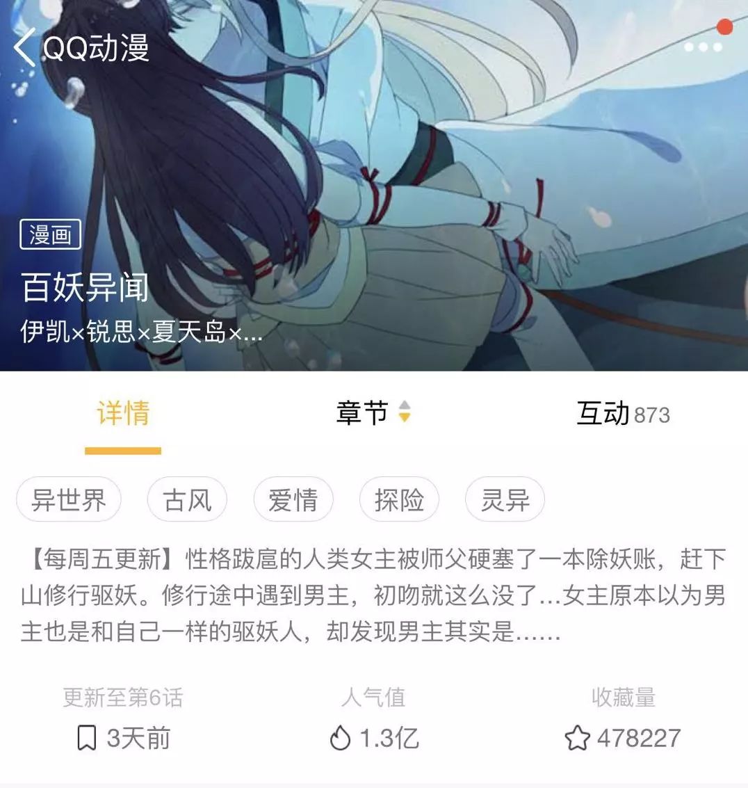 不错,就是一部名为《百妖异闻》的漫画。据了解,于4月20日独家登陆QQ动漫的全新原创国漫《百妖异闻》正式上线仅仅5天,阅读数就破亿,收藏量突破47万——这些数字和用户的口碑,不仅使得这部由夏天岛工作室带来的高质量作品俨然成为近年国漫最大黑马,更成为整个ACGN内容领域的年度爆款之一。