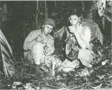 在壕沟里,有一位伙伴跟我在一起。可是,那名日本人挥砍了他的喉咙,直直砍到他颈背的韧带。他的气管还在喘气;他挣扎着要呼吸的声音恐怖极了。当然,他死了。那个日本鬼子砍过来时,温血溅满我握着麦克风的手。我正用密码呼叫求救。他们告诉我,尽管如此,我所说的每个音节都清楚地传达过去了。