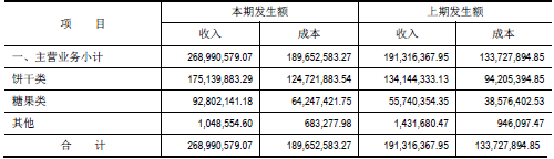 2017年,公司销售规模扩大,订单增加,导致主营业务收入的快速增长。饼干类产品销售收入较上期增长30.56%,糖果类产品本期销售收入较上年增长66.49%。