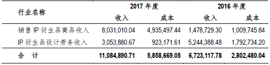 2017年,品牌设计推广占营业收入比重由上期的86.60%降低为47.16%,产品设计销售由上期占营收13.40%增长为52.84%,这正是公司IP 衍生战略布局的逐步展开的结果。
