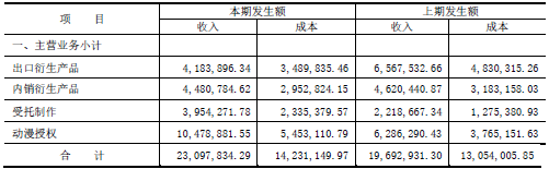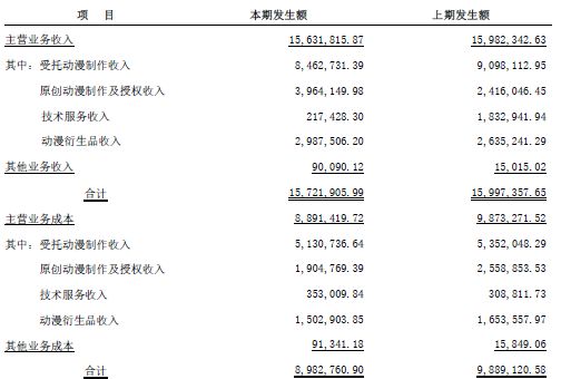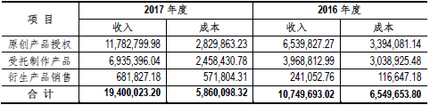2017年,公司主营业务收入较上期增幅17.29%。受托制作业务较上期增加78.23%,动漫授权较上期增加66.69%,主要由于2017 年公司新增学校教育平台的动漫节目业务。由于全球经济总体复苏乏力,出口衍生产品收入较上期下降36.29%。