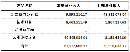 2017 年,公司新媒体动漫运营业务收入较2016 年减少68.63%,技术服务营业收入较2016 年增长9.35%,智能终端设备营业收入较2016 年增长59.40%。主要原因是公司开展自主产品销售,新媒体内容运营即新媒体动漫运营收入大幅减少。