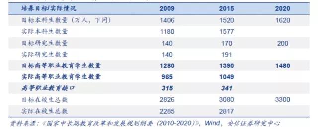据公开资料显示,《国家中长期教育改革和发展规划纲要(2010-2020)》希望2015年,高等职业教育在校生人数达到1390万人;实际仅达到1049万人,缺口为341万。