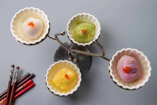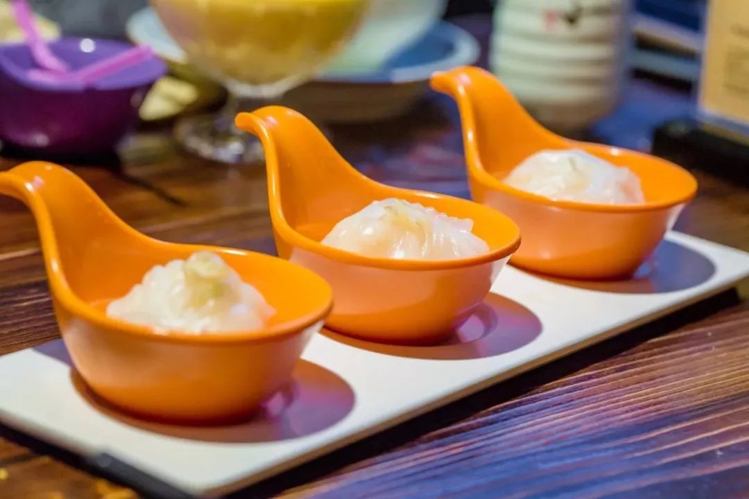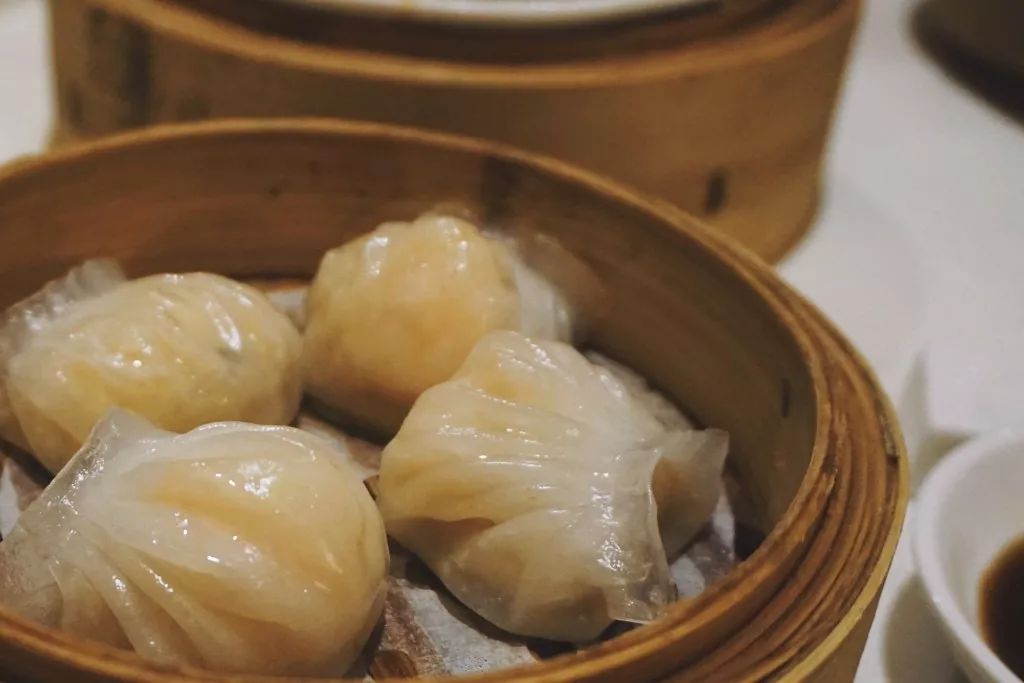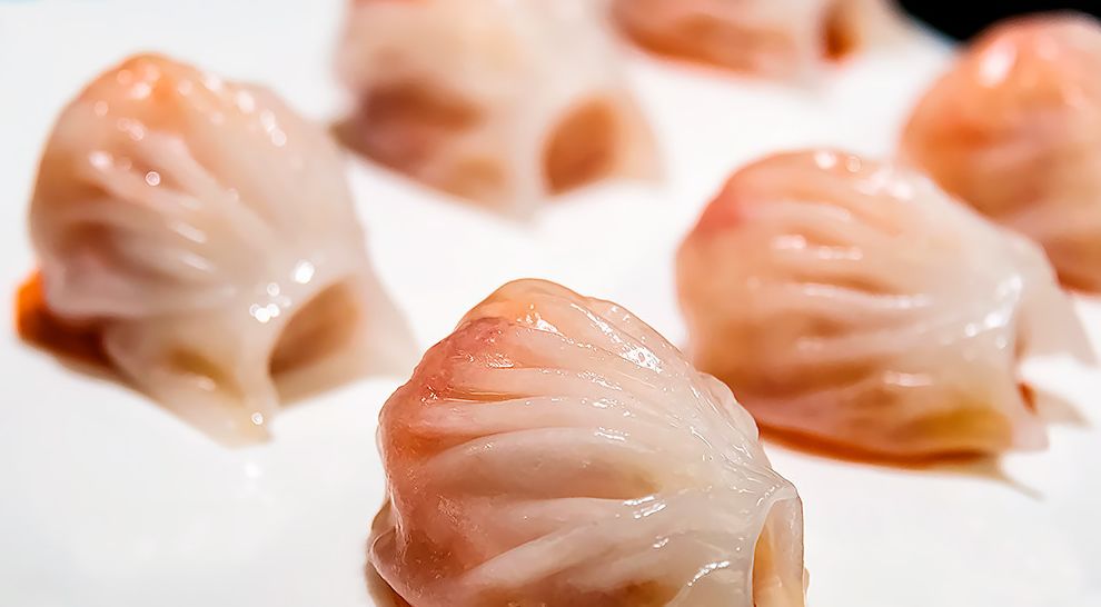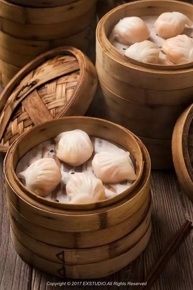 虾饺一直乃是“点心界四大天王”之首,传统的虾饺主要以肥肉搭配冬笋及鲜虾为主。极薄的透明外皮,是用以木薯生粉和马铃薯生粉特定比例调配的澄面而做,放进蒸笼蒸几分钟后,便呈现晶莹剔透的外型,口感Q弹,软韧有嚼头。
