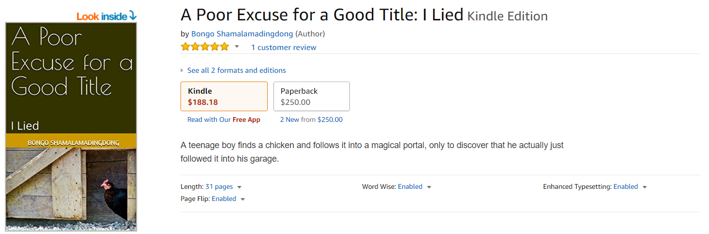 在帕特里克公布了他的遭遇之后,亚马逊下架了许多同样内容莫名其妙却标价数千美元的书籍。不过,仍有一些可疑书籍在售,比如一位名叫Bongo Shamalamadingdong的人写的《好标题的坏借口:我撒谎了》(A Poor Excuse for a Good Title: I Lied)。这本书的平装本售价250美元(约合人民币1582元),内容却是一句重复的话:“从前有只鸡,一名男孩尾随着这只鸡进入了一间车库,他以为这里是一处具有魔力的入口,但它实际上只是一间普通车库。”同样在售的还有Rich Dan Edward Knight Sr的《我生活里的富足满得都要永远溢出来了:布林克卡车永久地跟着我去每个地方(无论你问什么相信感受)》( I Have Abundance Overflowing In My Life Forever: Brinks Trucks Follow Me Everrywhere I Go Eternally (Whatever You Ask Believe Receive),这本书只有24页,却标价2999.99美元。目前,还没有证据能够证明这些书与诈骗活动有关。CreateSpace相关规定允许存在“具有重复性内容的恶搞书籍及故意省去某些内容的行为”,但前提是必须“明确将此类内容标注出来”。