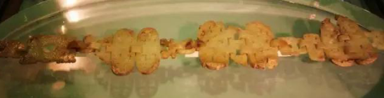 第十一节雕成三条蟠龙相连的玉佩状,龙身为"S"形,是春秋后期在中原开始流行的玉佩造型,十六节玉饰却巧妙地把它们用在一条大龙身上;
