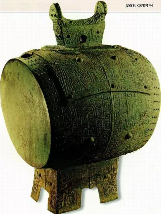 商代的青铜鼓仅有两具遗存,这件饕餮纹铜鼓便是其中之一。它形似横置的桶形,上宽下窄,两侧鼓面平素无纹。鼓身上有枕形钮,下有圈足底座,以便悬吊、安放。鼓身满饰云雷纹构成的饕餮纹,其外环简化成斜角形的夔纹。两端边缘饰乳丁三列,象征蒙鼓皮所用之钉。此鼓纹样繁而不乱,简而生神,大有凝重浑厚之气。
