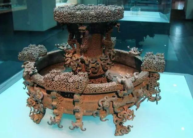 全套钟的装饰,有人、兽、龙、花和几何形纹,采用了圆雕、浮雕、阴刻、彩绘等多种技法,以赤、黑、黄色与青铜本色相映衬,显得庄重肃穆,精美壮观。1978年于湖北省随县(今随州市)擂鼓墩曾侯乙墓出土。(木架和部分挂钩系复制,其余均为原件)