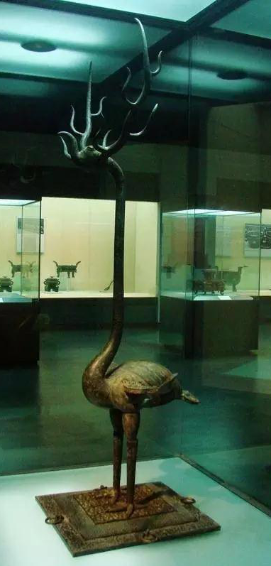 此器造型别致,是一件独具风格的青铜工艺精品。鹤和鹿是长寿和吉祥的象征。把鹿角插入鹤头,将二者置于一身,可称之为“瑞鹤”。古人把仙人乘车叫“鹤驭”、“鹤驾”。此器出于墓主人棺侧,可能反映了死者成仙升天的思想。