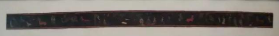 1987年湖北省荆门包山2号墓出土画面用土黄、桔红、海蓝、棕四色漆,绘人物26个。骖车、骈车各两乘,大雁9只,狗2只,猪l头,树5棵,构成一幅聘礼行迎图。