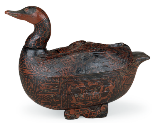 这件漆盒上的图像给了我们答案,这是一件首饰盒,其腹部两侧分别绘制着撞钟击磬、击鼓起舞的图像,为研究曾侯乙乐器的演奏方法提供了形象资料。中国的漆器至少在7000年前就已经出现,现在在世界范围被广泛使用。