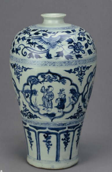 2006年湖北钟祥郢靖王墓出土,是最著名的元青花之一。所绘“四爱图”,故事取材高雅,寓意深远。分别绘有:宋代著名理学家周敦颐与莲花,象征其品德高尚、廉洁奉公;东晋著名书法家王羲与兰花,以喻其隐逸高雅;东晋著名诗人陶渊明与菊花,以喻其淡泊名利;北宋著名诗人林和靖与梅花、仙鹤,以喻其傲霜脱俗。