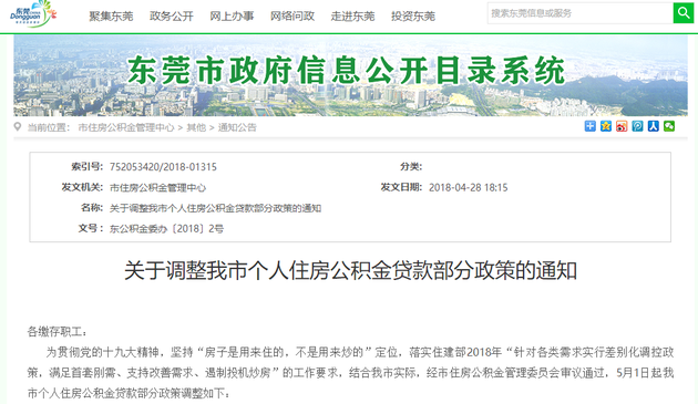 4月28日,东莞市住房公积金管理中心官网发布《关于调整我市个人住房公积金贷款部分政策的通知》,规定购买首套自住住房,最高贷款额度为120万元;购买第二套自住住房,最高贷款额度为80万元。同时取消了原来对于最高贷款额度的单/双职工区分(原来要求单缴存职工最高50万、双缴存职工最高80万)。该官网还发布了本次新政的解读,并自5月1日起实施。