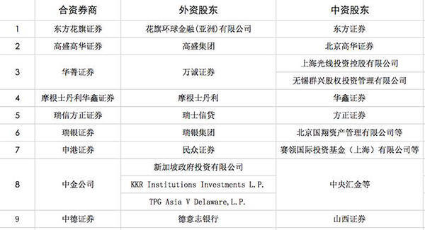 早前据澎湃新闻记者的不完全统计,最先有望分得新政策一杯羹的合资券商有东方花旗证券、高盛高华证券、华菁证券、摩根士丹利华鑫证券、瑞信方正证券、瑞银证券、申港证券、中金公司、中德证券等共计9家,其股东信息如下表所示。