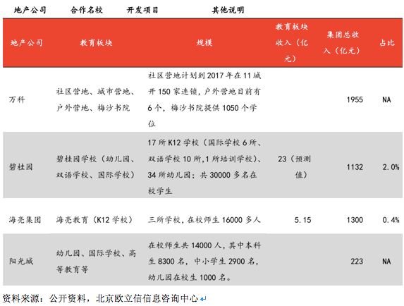 目前,中国最大的几家房企,正在成为中国最大的私立教育供应商。万科、恒大、碧桂园都成立了自己的教育品牌,很多地产公司或集团母公司都纷纷成立独立的教育事业部,如碧桂园、万科、海亮集团、阳光城等。