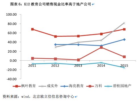 其次,在二胎和消费升级的环境下,孩子的钱最好赚,教育资产的盈利能力非常强。从万科、碧桂园等几家公司披露的财务信息可以看出,由于教育都是学费预缴,教育公司的销售现金比率要明显高于地产公司,而且净资产收益率和地产行业相当。