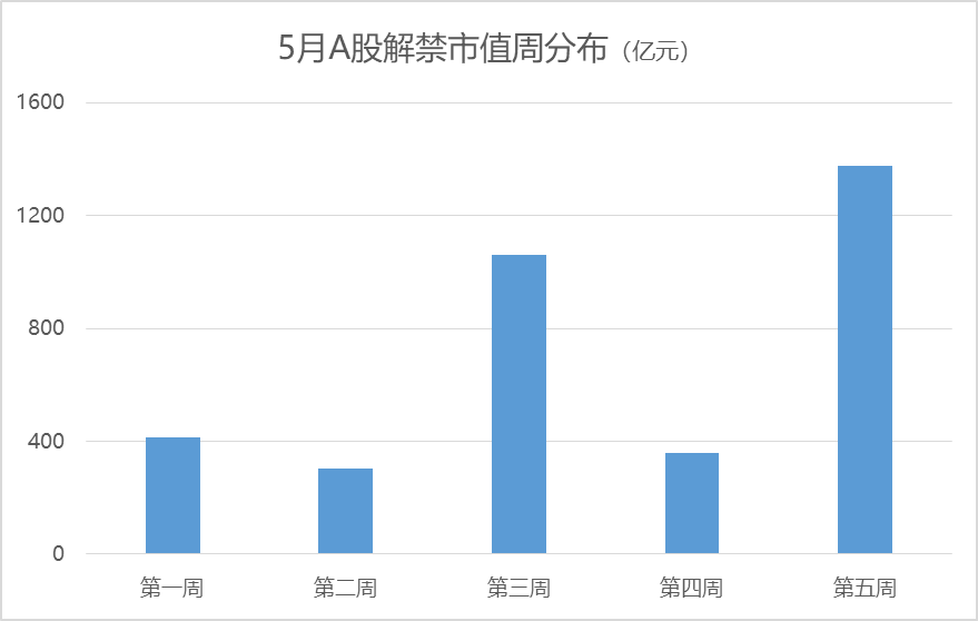 Wind数据显示,5月份A股预计有169家公司,447.30亿股限售股上市流通,以4月27日收盘价计算(下同),合计解禁市值3511.68亿元。5月份的第三周和最后一周,解禁市值均超过1000亿元。