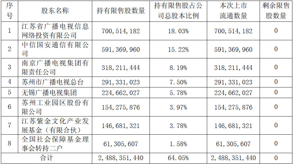 根据公告,江苏有线5月2日有24.88亿股首发限售股上市流通,占总股本比例超过六成,合计市值167.22亿元。