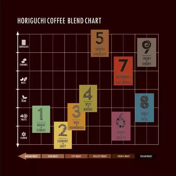 在堀口,最让人着迷的当然是他对咖啡豆的拼配方式,已不同时令不同产地的咖啡豆混合,采用不同的烘焙方式。