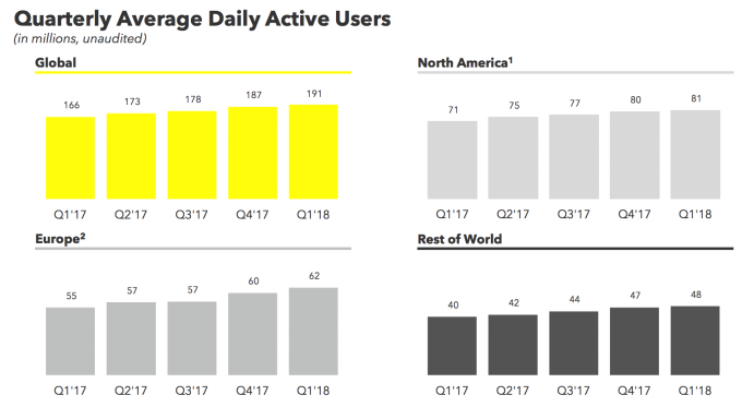 财报显示,该季度Snapchat的日均活跃用户数仅为1.91亿,虽略高于上一季度的1.87亿,但增长率却跌至2.13%;作为比较,2017年第四季度,Snapchat的日活增长率为5.05%。