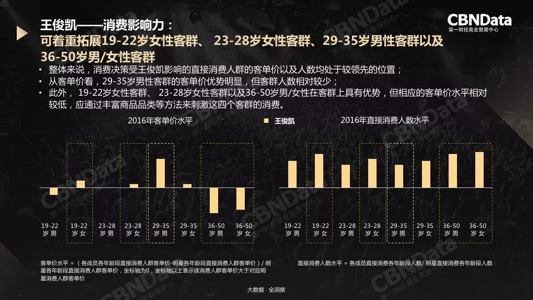 可帅可酷可亲切,可型可萌可创作,“超强影响力综合实力王”便是CBNData《TFBOYS商业价值洞察》给王俊凯的评价,数据显示2016年他的直接消费价值整体较前一年增长181%,同款消费价值排名第一位,其中19-22岁女性客群、23-28岁女性客群、29-35岁男性客群以及36-50岁男/女性客群属可着重拓展人群。从迷妹、熟男到姐姐、阿姨,不敢想象2018年的王俊凯效应又会奉上何等惊喜。这对于有认真研读《CBNData明星商业价值洞察》测算逻辑的人而言,或早已预见商机,为迎接惊喜而备。