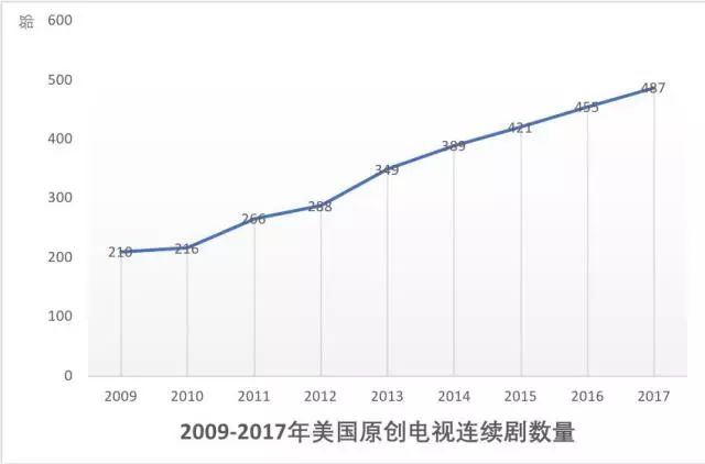 数据显示,2009年至2015年,美剧制播数量不断攀升。2017年美剧制播数量为487部,相较于2016年,增长了7%。John Landgraf(FX首席执行官)预计,2018年各平台原创美剧制播数量将达到520部之多。