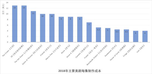 各平台自制剧投入不仅增加了电视剧数量,更提高了单集制作成本。Netflix 自制剧历史剧The Crown《王冠》第一季造价1.3亿美元,平均每集成本1300万美元。Amazon自制动作片Jack Ryan《杰克·莱恩》每集造价800万美元,喜剧The Tick《超级蜱人》每半个小时成本500万美元。