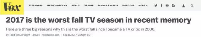 近几年,美剧在中国热度不减反增。近日,随着《西部世界》第二季的开播,多部美剧陆续上档,美剧回归的热潮再次席卷中国,尽管国内还未同步更新,美剧铁杆粉丝却已迫不及待地找来“生肉”一睹为快。但事实上,2017年美剧在美国本土表现并不抢眼。Vox 新闻网站有评论家撰文称“2017年美剧秋季档是2006年后表现最差的档期”。