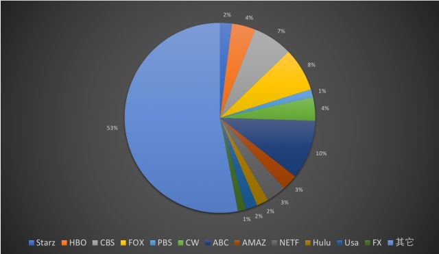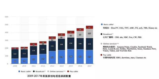 2017年有175部电视剧来自AMC, FX, USA等有线台,153部剧来ABC, NBC, FOX, 及CBS等的公共电视广播网,两者占据了原创电视剧数量的67%。但公共广播电视网四大频道,ABC, CBS, NBC 及Fox等广播电视网平台对新美剧制播投入渐趋谨慎。