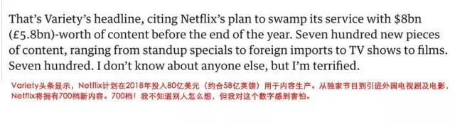 英国《卫报》电视专栏作家Stuart Heritage对Netflix2018年投入80亿美元用于引进及制作700部电视节目高喊感到恐慌。