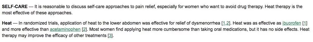 最权威的临床医学决策支持系统 UpToDate 上,评估了除了药物治疗之外的各种护理方法的有效性,包括瑜伽锻炼、喝牛奶、喝姜水等方法,得出结论:热敷是最有效的,其效果甚至媲美于止痛药的效果。