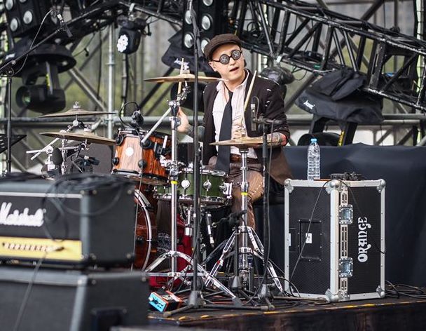 鼓手白熙东扮的是“慈善家”,钮扣眼镜上的图形,并没影响他打鼓下锤。