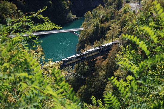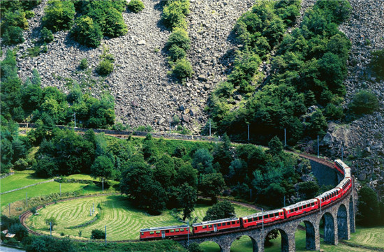 列车无需借助齿条齿轮传动就可轻松攀越海拔2253米的伯尔尼纳山口。沿途景色绮丽,其中有些已被列入联合国教科文组织世界遗产名录。