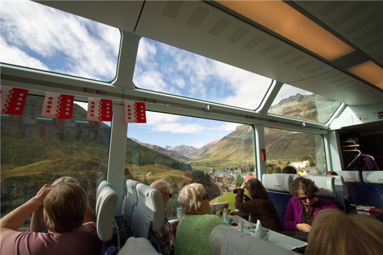 从瑞士东部到西部的阿尔卑斯山,全景列车运行7.5小时,穿行在瑞士阿尔卑斯山的中心地带。