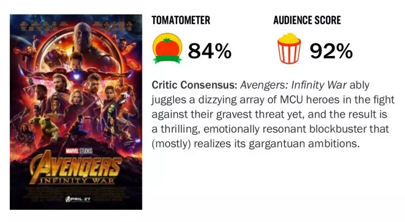 虽然国内要到5月11日才能上映,但已于海外率先开画的《复仇者联盟3》,在口碑与评价方面已然势不可挡。目前,烂番茄新鲜度 84% ,IMDB 9.0,国内豆瓣评分8.5。