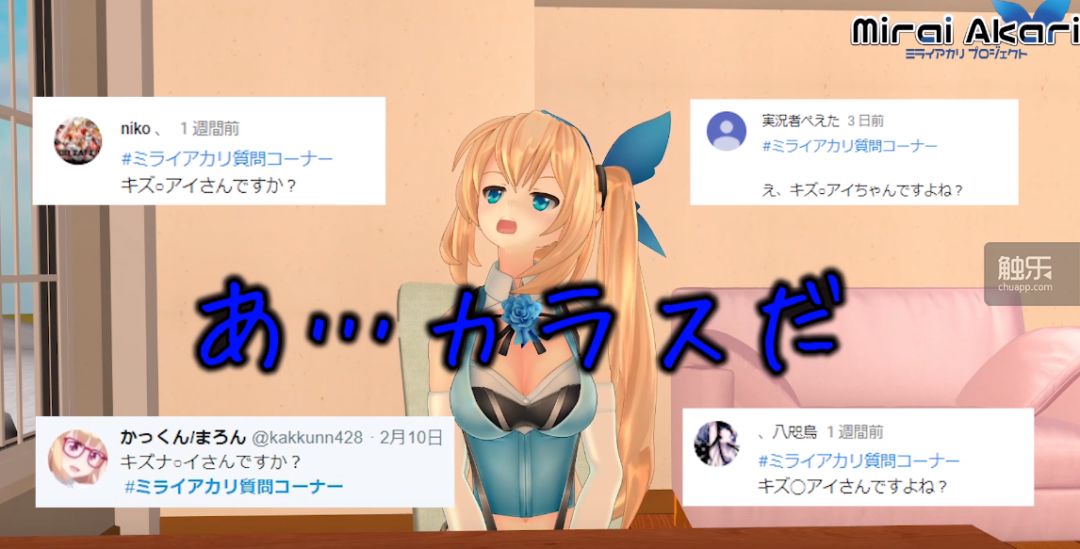 口癖“啊,是乌鸦”。这是在回答提问时,被问及“中之人是绊爱吧”时的反应。