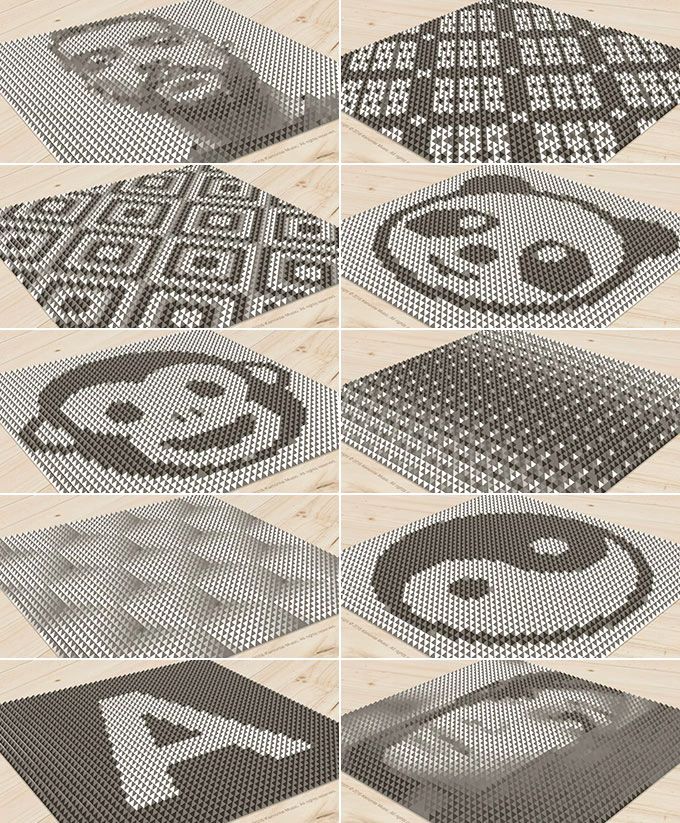 借助金字塔结构,在两侧采用不同灰度,结合 8 级灰度,可组合 64 种不同的小金字塔,并由此成就双面像。