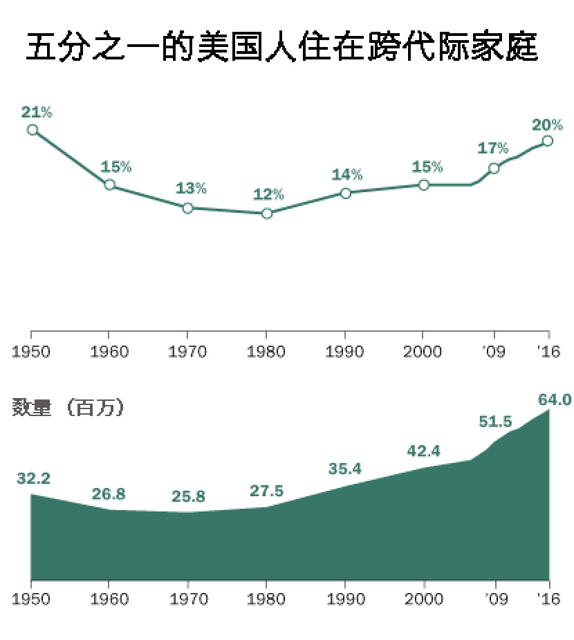 多代际同居家庭指的是和不同辈分的成年家人住在一起的家庭。在2016年,所有美国人中有6400万人属于多代际同居家庭,他们占到总人口的20%,创下历史记录。这个趋势在金融危机后,美国经济逐渐复苏的时期也没有发生改变。