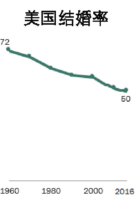 现如今有一半的美国成年人已婚,这个比例在最近几年来都保持在相对稳定的水平。但是,和前几个十年相比,这个比率还是较小了很多。比如在1960年代,已婚美国人数占到所有成年人的72%。