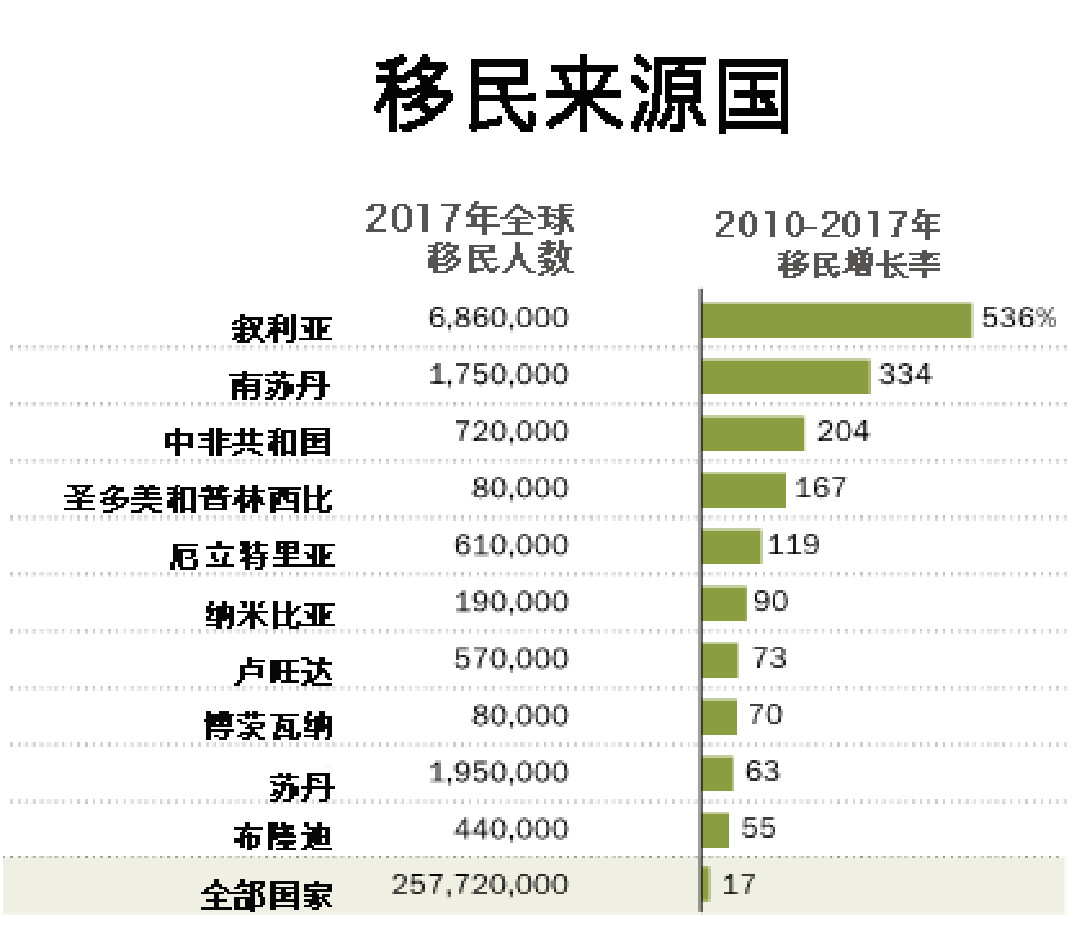 根据美国政府发布的最新数据,2017年全球移民人口达到2亿5千万。从2010年以来,10个人口增长速度最快的国际移民国家中,撒哈拉沙漠以南的非洲国家就占到8个。2010年到2017年间,来自这些国家的移民中每个国家增加50%,和同期17%的世界平均水平相比要高得多。自2010年以来,至少有100万的来自这些国家的移民去了欧洲。