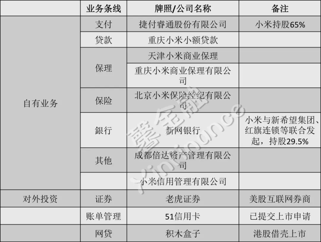 无论是价格一路水涨船高的第三方支付牌照,还是新金融行业分量最重的民营银行牌照都已经被小米收入囊中。另外,小米还布局了网络小贷、保险经纪、商业保理等牌照。