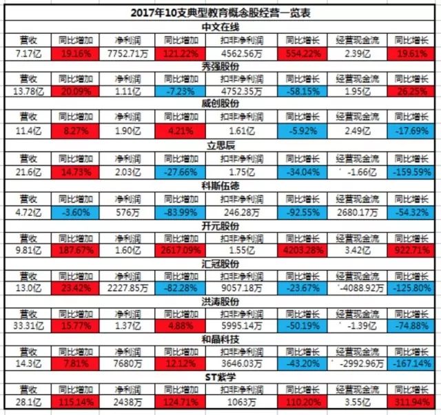 蓝鲸教育选取10家教育行业中较知名的典型公司,观察其2017年业绩及自2017年12月至今的增/减持、高送转和质押行为,推测这些公司教育业务的实际经营情况。这10家公司2017年年报披露的主要财务性数据,如下图所示。