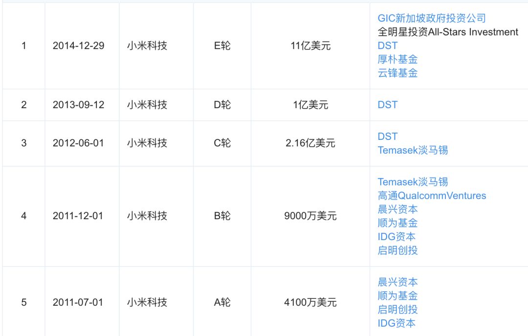上图为小米的5轮融资