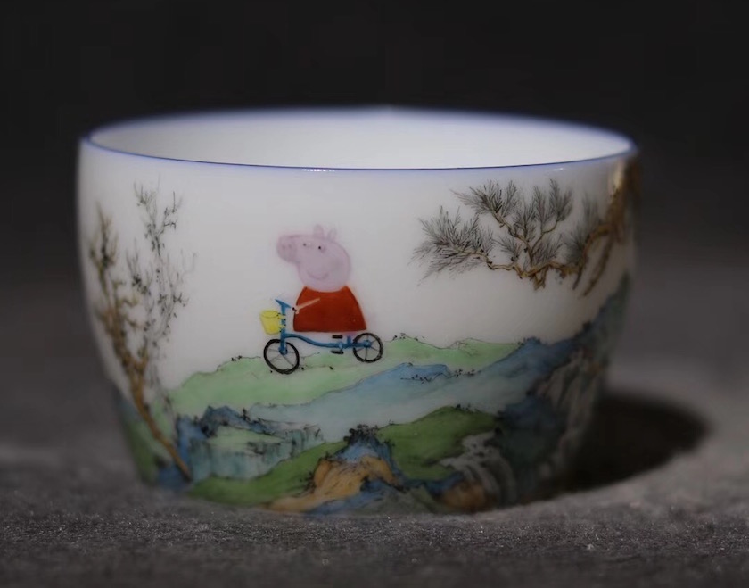 一只普通形制的瓷杯,上面绘制的传统的青绿山水,还有一只骑着自行车、一脸微笑的小猪佩奇。